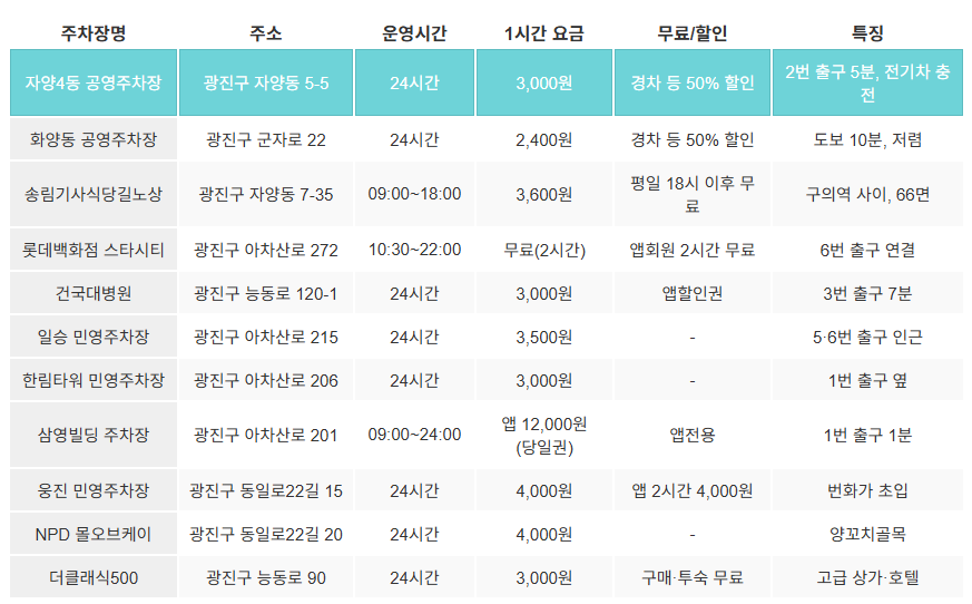 건대입구역 주변 저렴한 주차장 요약 표