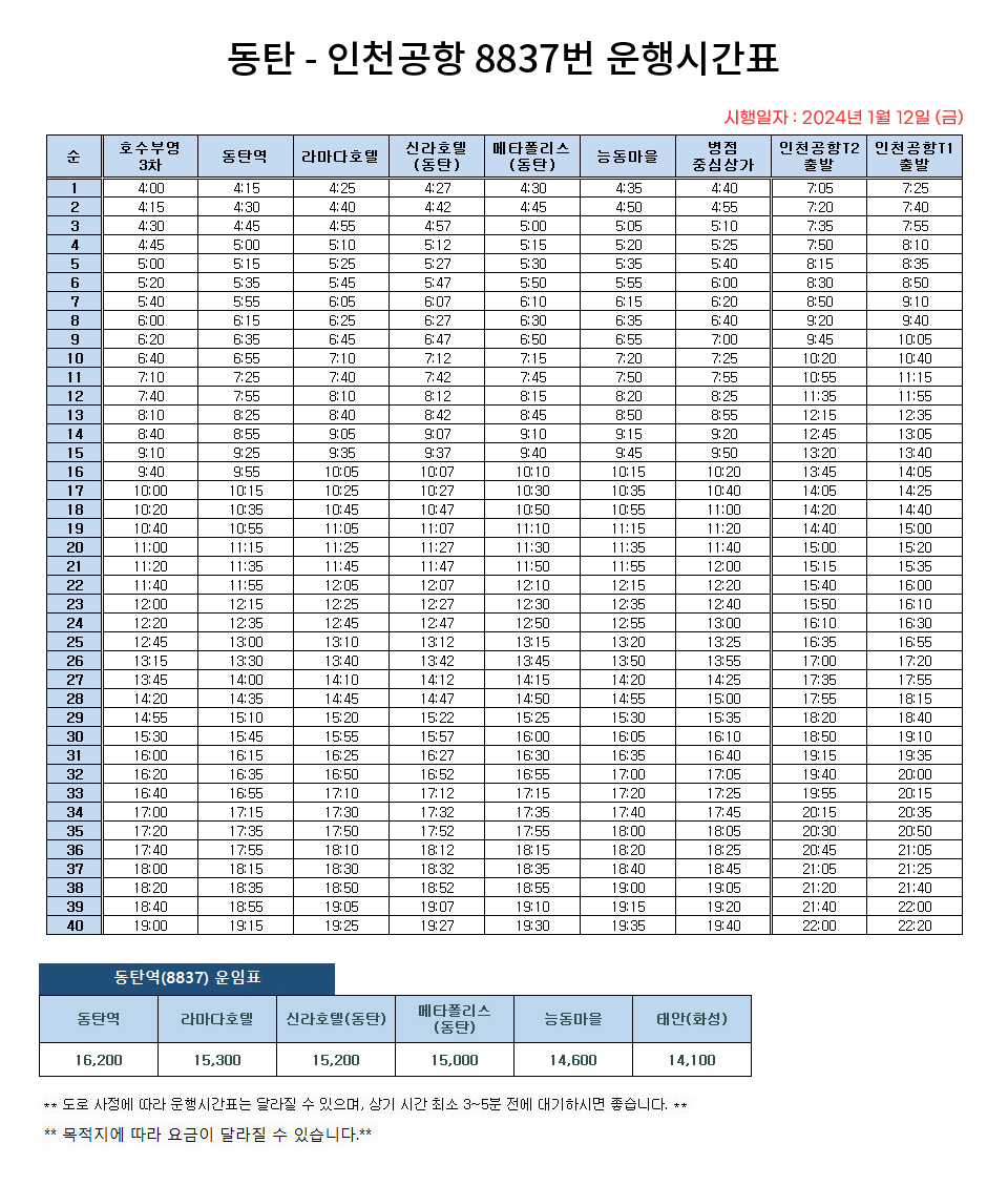 동탄 인천공항 리무진 8837번 시간표