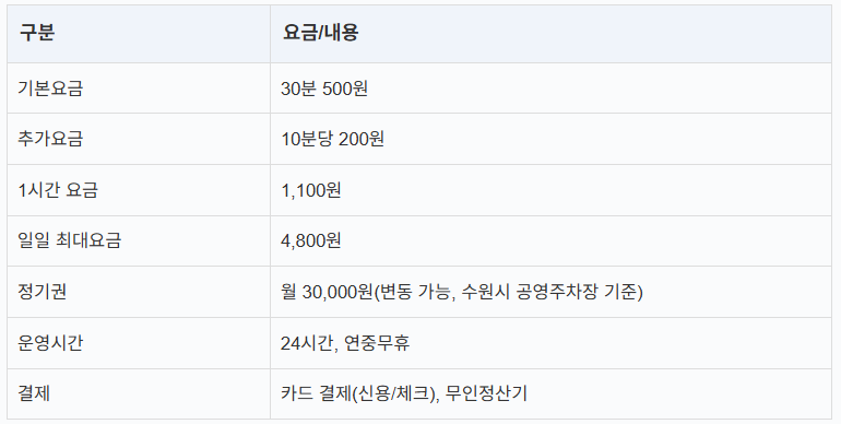 - 정기권: 수원시 공영주차장 정기권 신청 시 월 3만원대 이용 가능