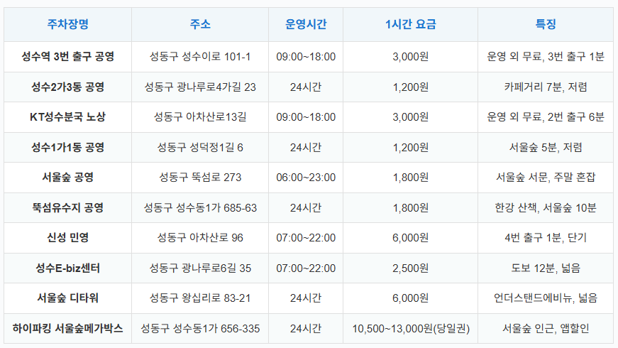 이 글에서는 성수역 공영주차장, 민영주차장, 서울숲 주차장의