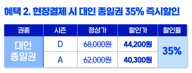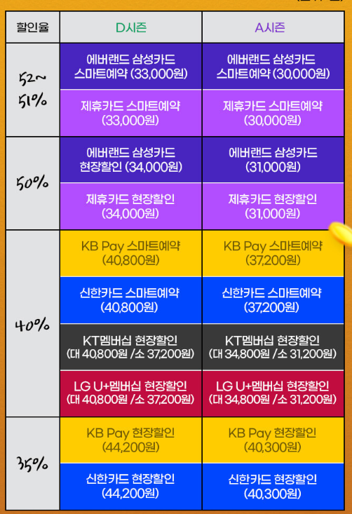 제휴카드 사용시 현장 매표소 할인율 50% 입니다.