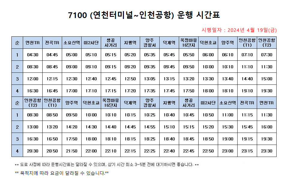 연천터미널 인천공항 7100 리무진 운행 시간표
