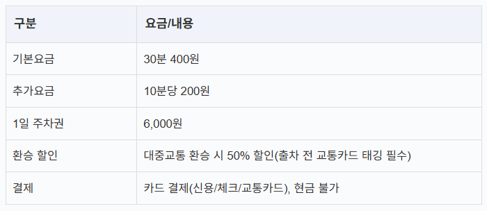 - 장기 주차 시 1일권(6,000원) 이용이 경제적