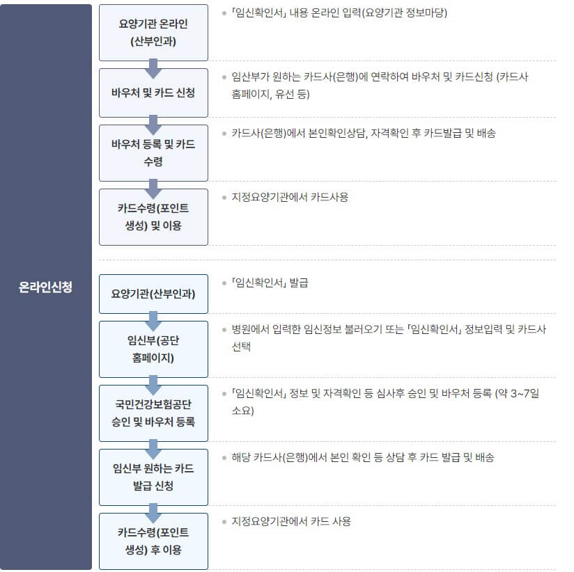 - 온라인 신청 : ①요양기관에서 임신확인정보를 요양기관 정보마당(medi.nhis.or.kr) 홈페이지를 통해 입력하고, 임신부가 금융사 홈페이지 또는 전화로 이용권(카드)신청② 공단 홈페이지에서 요양기관에서 입력한 임신확인정보를 불러오거나, 임신정보가 미입력된 경우 본인이「임신확인서」 내용을 입력 및 카드사를 선택하여 신청(공단의 승인 심사 후 카드발급 진행)