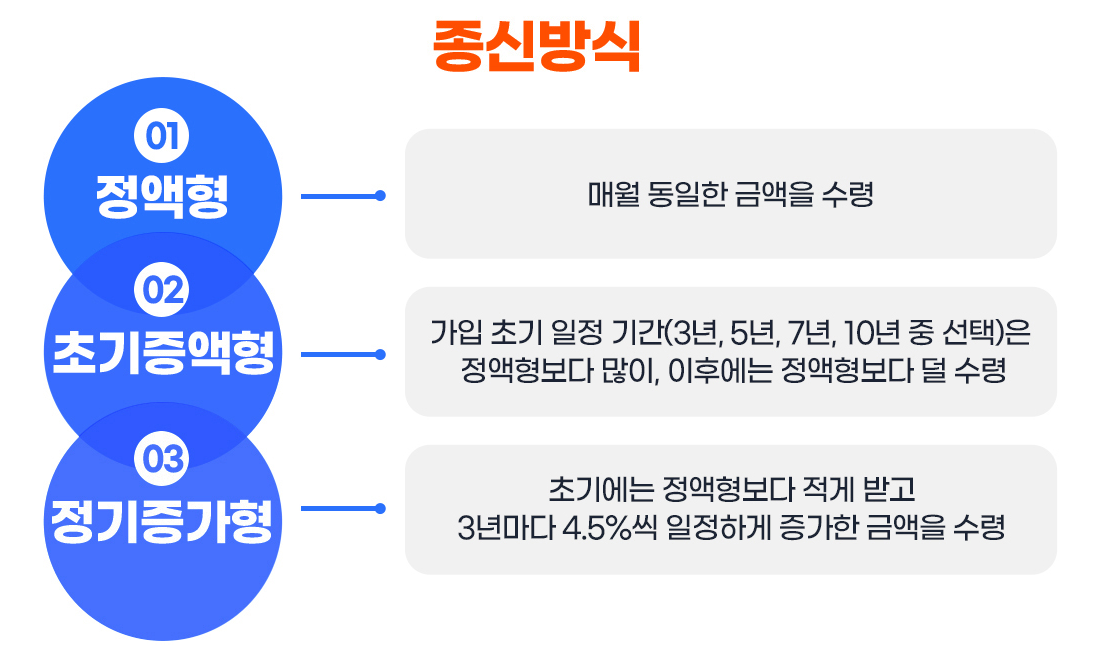 평생 동안 매월 연금 방식으로 수령하는 종신방식과 일정기간 동안 받는 확정기간 혼합방식이 있습니다.