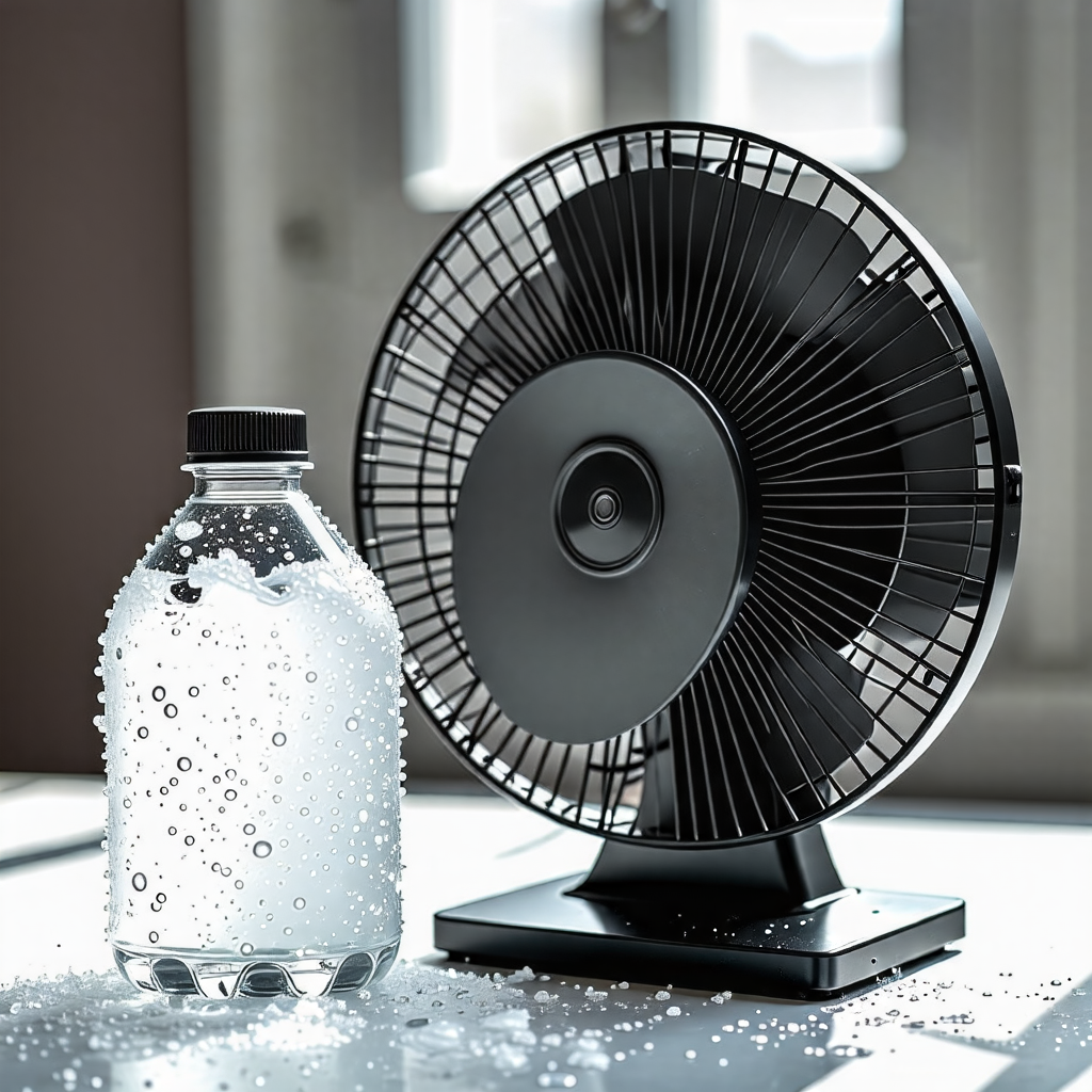 페트병에 물을 가득 채우고 얼린뒤 선풍기를 틀어 놓습니다.