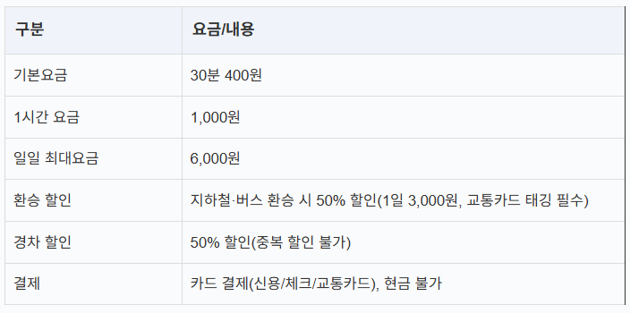 - 환승 할인은 반드시 출차 전 교통카드 태깅(지하철·버스 이용 후 30분 이내 정산)