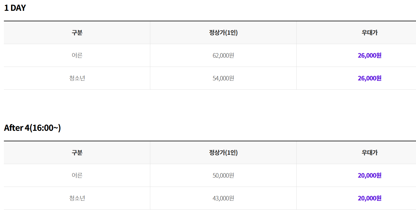 - 할인혜택 종일권 : 26,000원 / 16시 이후 20,000원