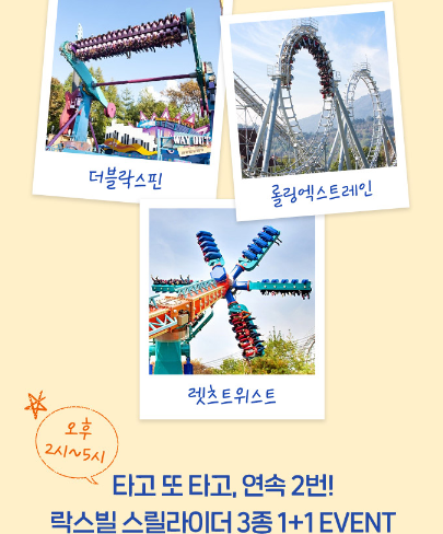 - 추가혜택 : 2024년 11월 18일부터 12월 초까지 어트랙션 3종(더블락스핀, 롤링엑스트레인, 렛츠트위스트)에 대해 1+1 특별 이벤트를 진행하여, 해당 어트랙션을 2회 연속 탑승할 수 있음