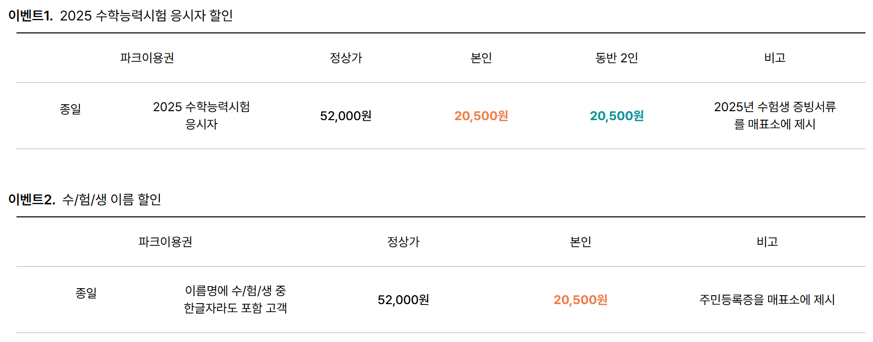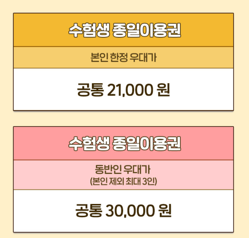 - 할인혜택 : 종일권 > 수험생은 20,000원 / 동반 2인까지 1인당 20,500원