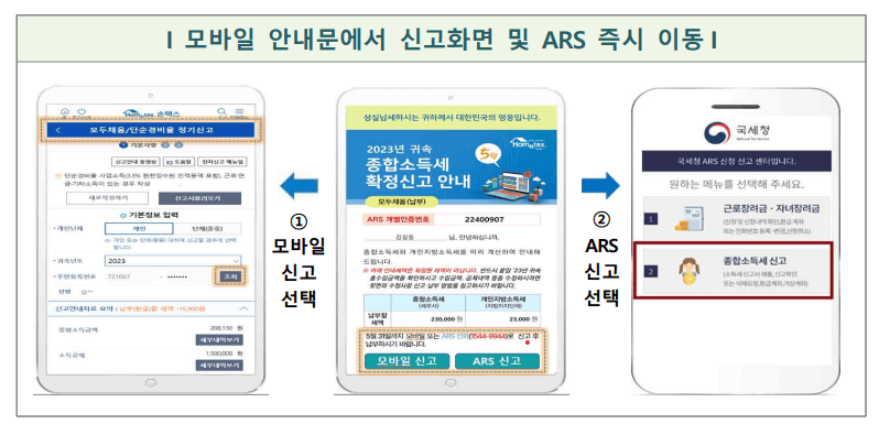 모바일 모두채움 안내문의 모바일 신고를 누르면 손택스 신고화면으로 바로 이동하며 ARS 신고 를 누그면 보이는 ARS 화면에서 쉽게 신고 할수 있습니다.