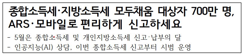 2024년 5월은 종합소득세 및 개인지방소득세 신고 납부의 달입니다. 올해는 세액을 미리 계산하여 700만 명에게 안내문 (5월1일 수요일부터) 을 제공하고, 인적용역 소득자 460만명에게는 환금예상액을 발송한다고 합니다.