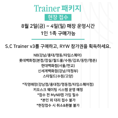 - 뉴발란스 직영점 포함 총 17개 매장에서 SC Trainer V3 구매시 참가권 증정 (8월 2일~8월 4일)