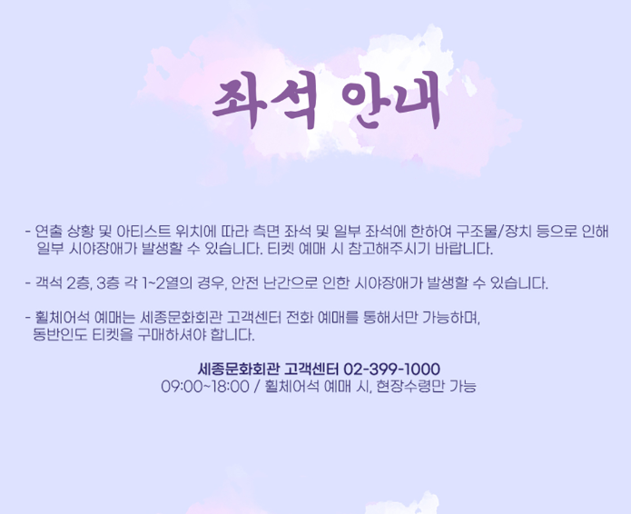 - 휠체어석 예매: 세종문화회관 고객센터(☎ 02-399-1000)를 통해 전화 예매만 가능